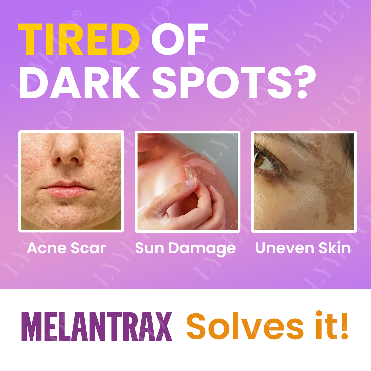 Είτε πρόκειται για επίμονες ουλές ακμής, βλάβες από τον ήλιο ή ανομοιόμορφο τόνο δέρματος, το MelantraX είναι η απάντησή σας για πιο καθαρό και φωτεινό δέρμα. Η προηγμένη φόρμουλά μας στοχεύει όλους τους τύπους υπερμελάγχρωσης στη ρίζα, διασπώντας την περίσσεια μελανίνης και προάγοντας την υγιή ανανέωση των κυττάρων.